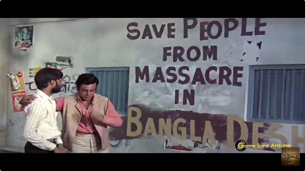 Midway through the song, shot on a rather low budget set, you see a graffiti on a street wall stating, “Save people from massacre in Bangladesh”. The film was released when the Bangladesh Liberation War was at its peak and while Twitter or other social media channels didn’t exist back then, cinema was a medium of propagating ideas. Today most viewers might miss it but I do believe audience back then must have noticed it. Back then “all eyes were on Dhaka”, that 53 years later the massacre continues but our eyes choose to look elsewhere is telling…
